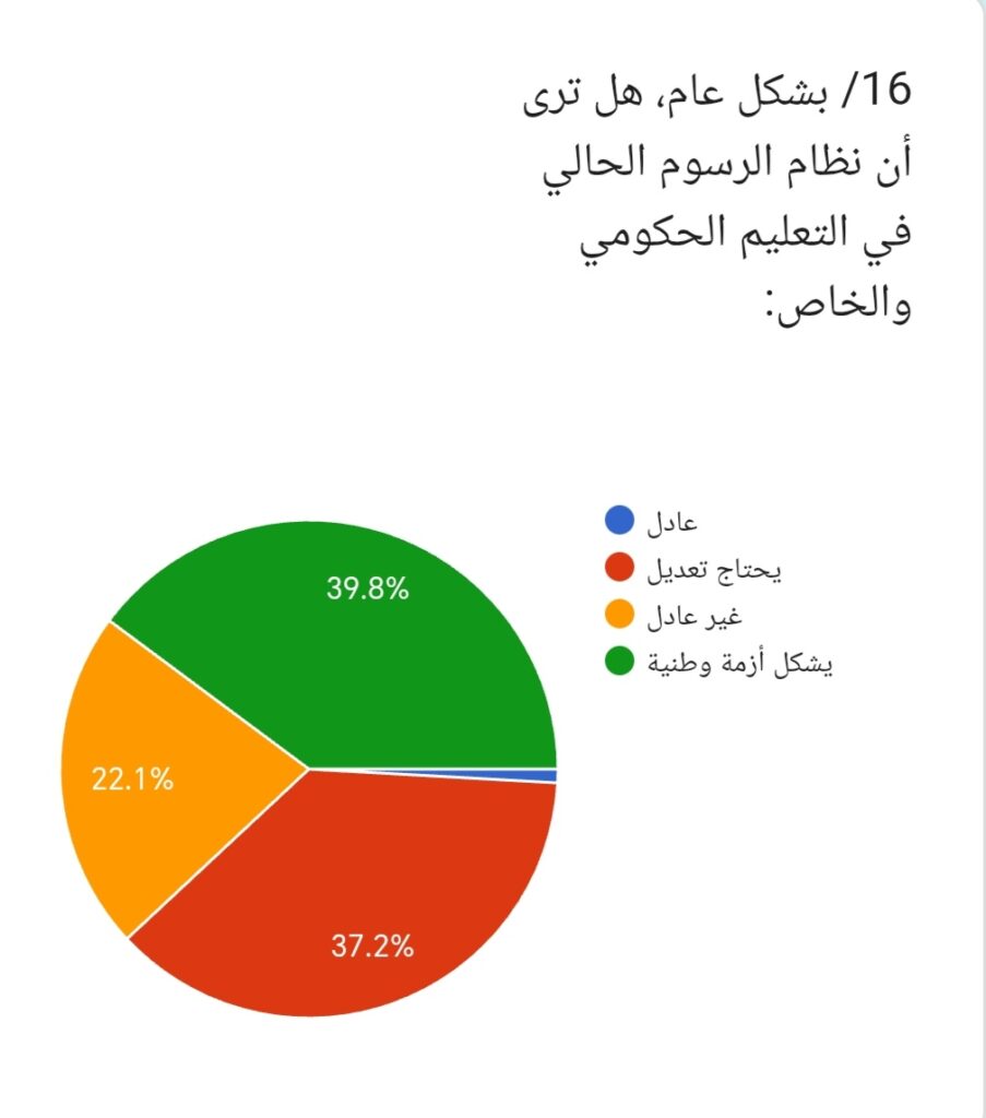 16/ وعند سؤال المشاركين: هل ترى أن نظام الرسوم الحالي؟ أجاب 39.8% يشكل أزمة وطنية، بينما قال 37.2% يحتاج تعديل، في حين رأى 22.1% غير عادل، وأجاب 0.9% عادل. وتؤكد هذه المؤشرات أن الرأي العام يميل إلى ضرورة مراجعة نظام الرسوم الحالي وإعادة تنظيمه.