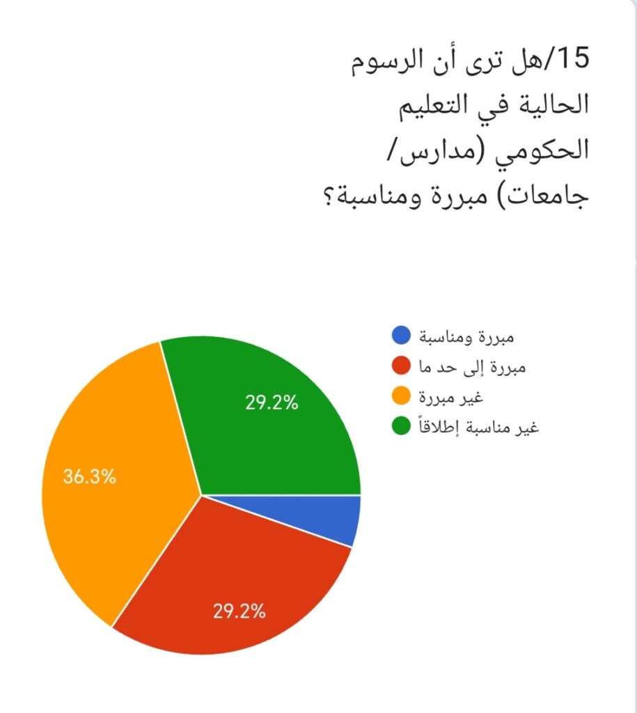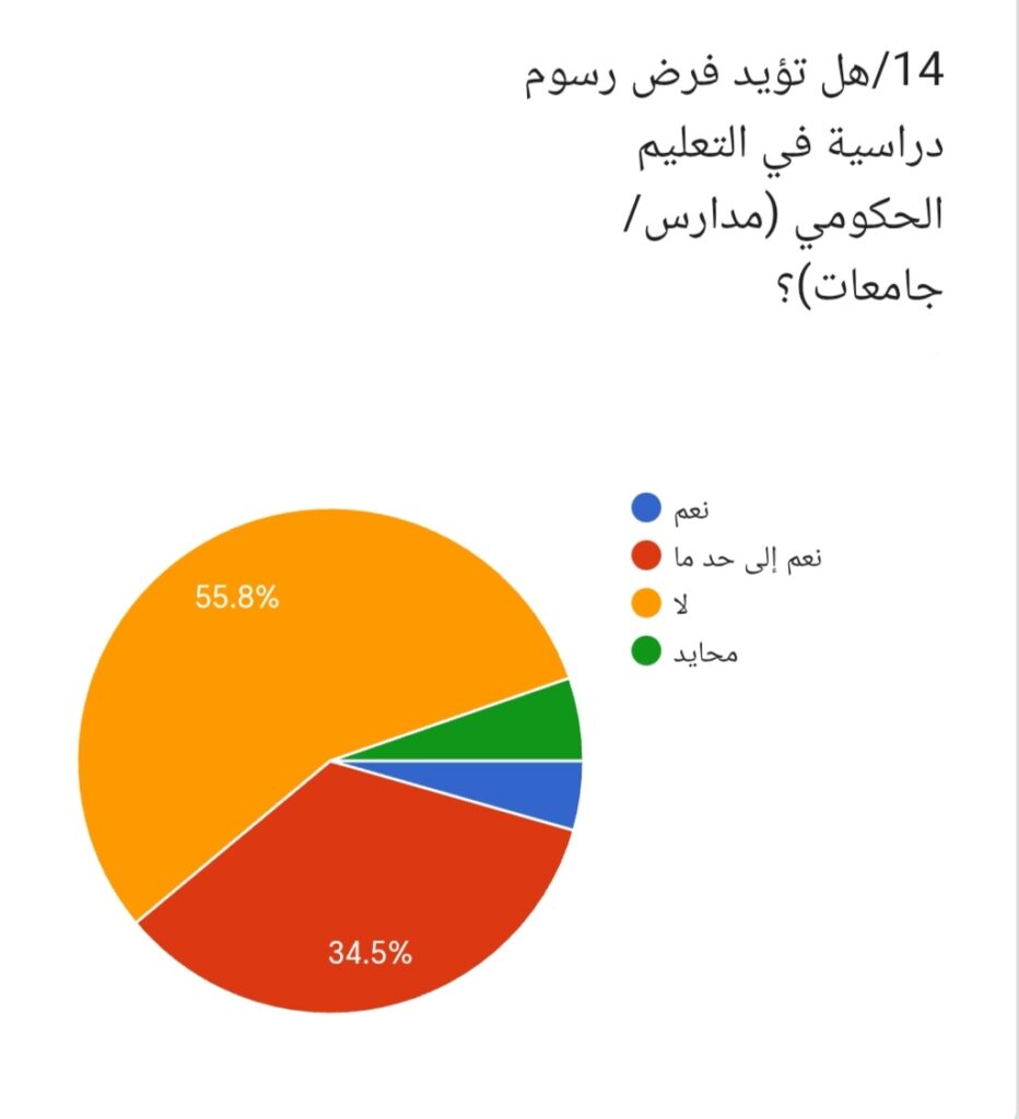 14/ وعند سؤال المشاركين: هل تؤيد فرض رسوم في التعليم الحكومي؟ أجاب 55.8% لا، بينما قال 34.5% نعم إلى حد ما، في حين رأى 4.8% نعم، وأجاب 4.9% محايد. وتبين هذه النتيجة أن غالبية المشاركين ترفض فرض رسوم في التعليم الحكومي.