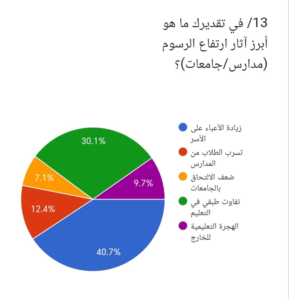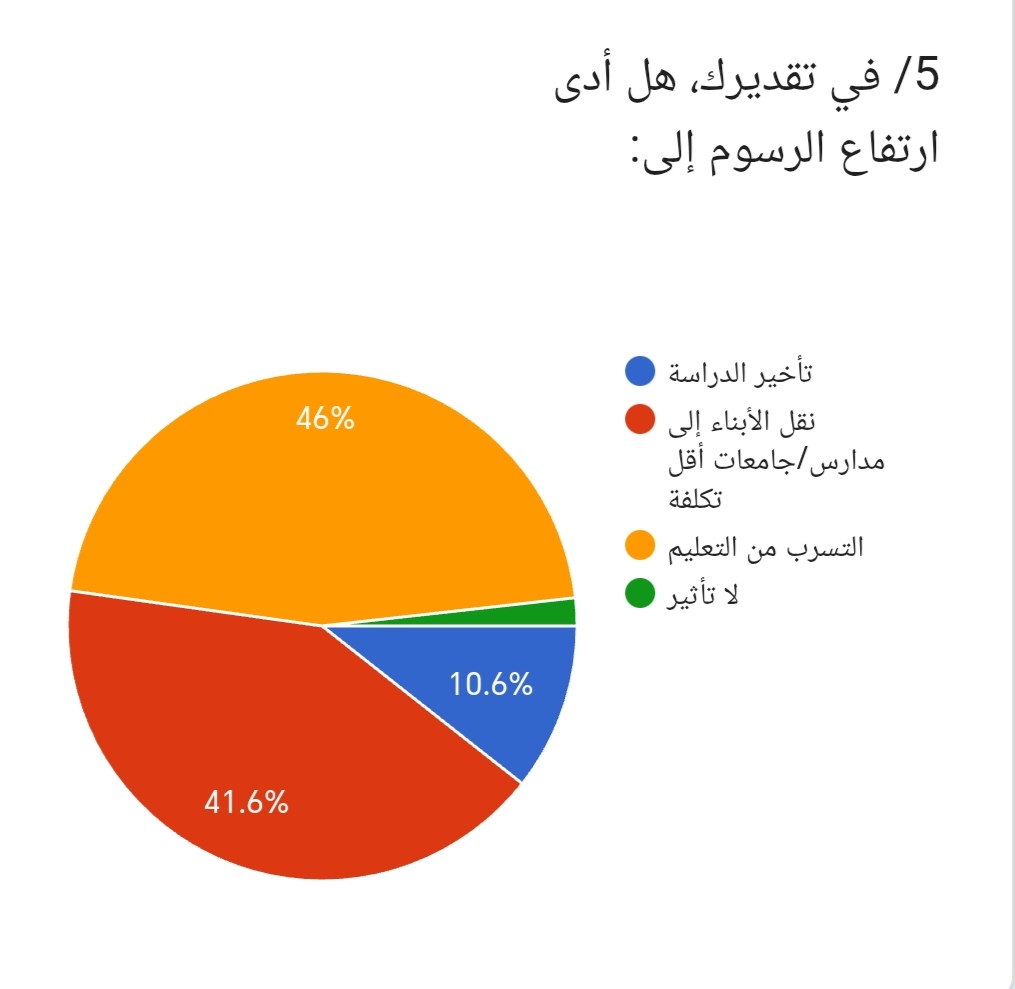 5/ وعند سؤال المشاركين عن تقديرهم لأثر ارتفاع الرسوم أجاب 46% ان الاثر تمثل في الهجر أو التسرب من التعليم، بينما قال 41.6% انه تمثل نقل الأبناء إلى مدارس أو جامعات أقل تكلفة، في حين رأى 10.6% انه أدى الى تأخر سنوات الدراسة، وأشار 1.8% إلى عدم وجود تأثير. وتكشف هذه النتائج أن ارتفاع الرسوم يرتبط مباشرة بتراجع فرص الاستمرار في التعليم.