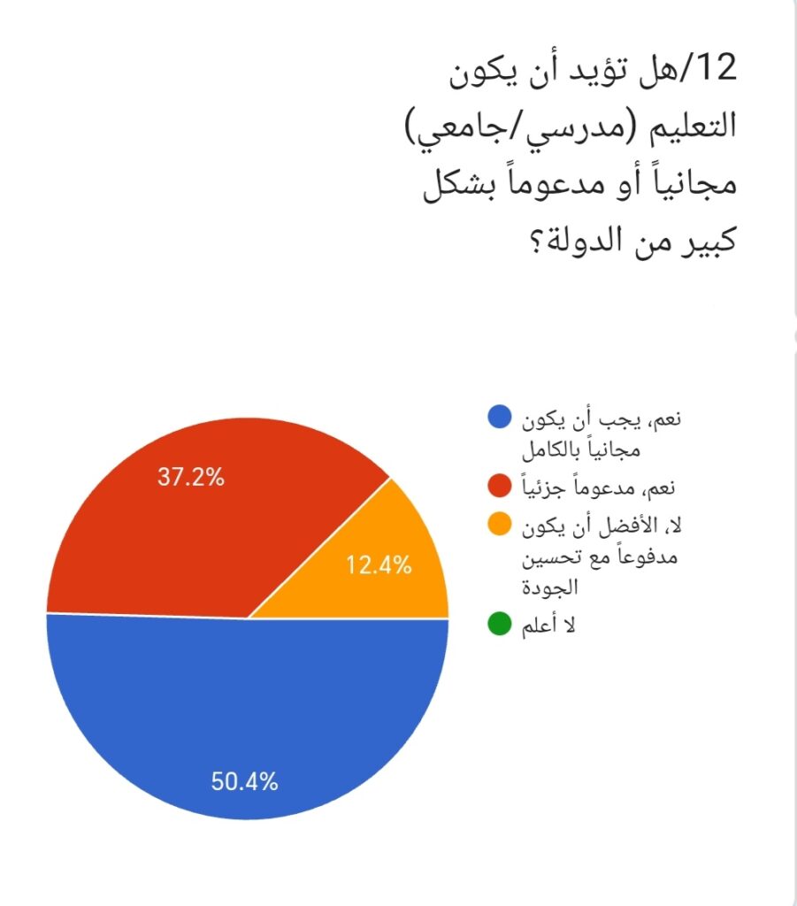 12/ وعند سؤال المشاركين: هل تؤيد أن يكون التعليم مجانياً أو مدعوماً بشكل كبير؟ أجاب 50.4% نعم مجانياً بالكامل، بينما قال 37.2% نعم مدعوماً جزئياً، في حين رأى 12.4% أن يكون مدفوعاً مع تحسين الجودة. وتبين هذه النتيجة وجود اتجاه واسع لدعم مجانية التعليم.