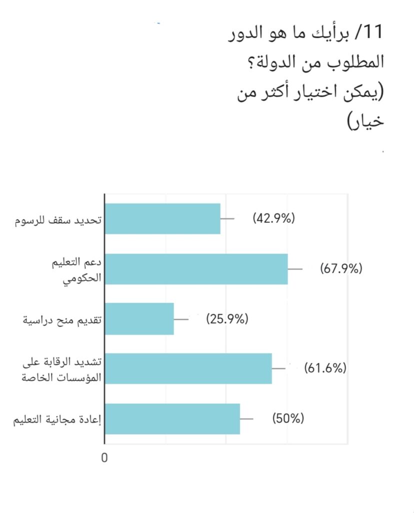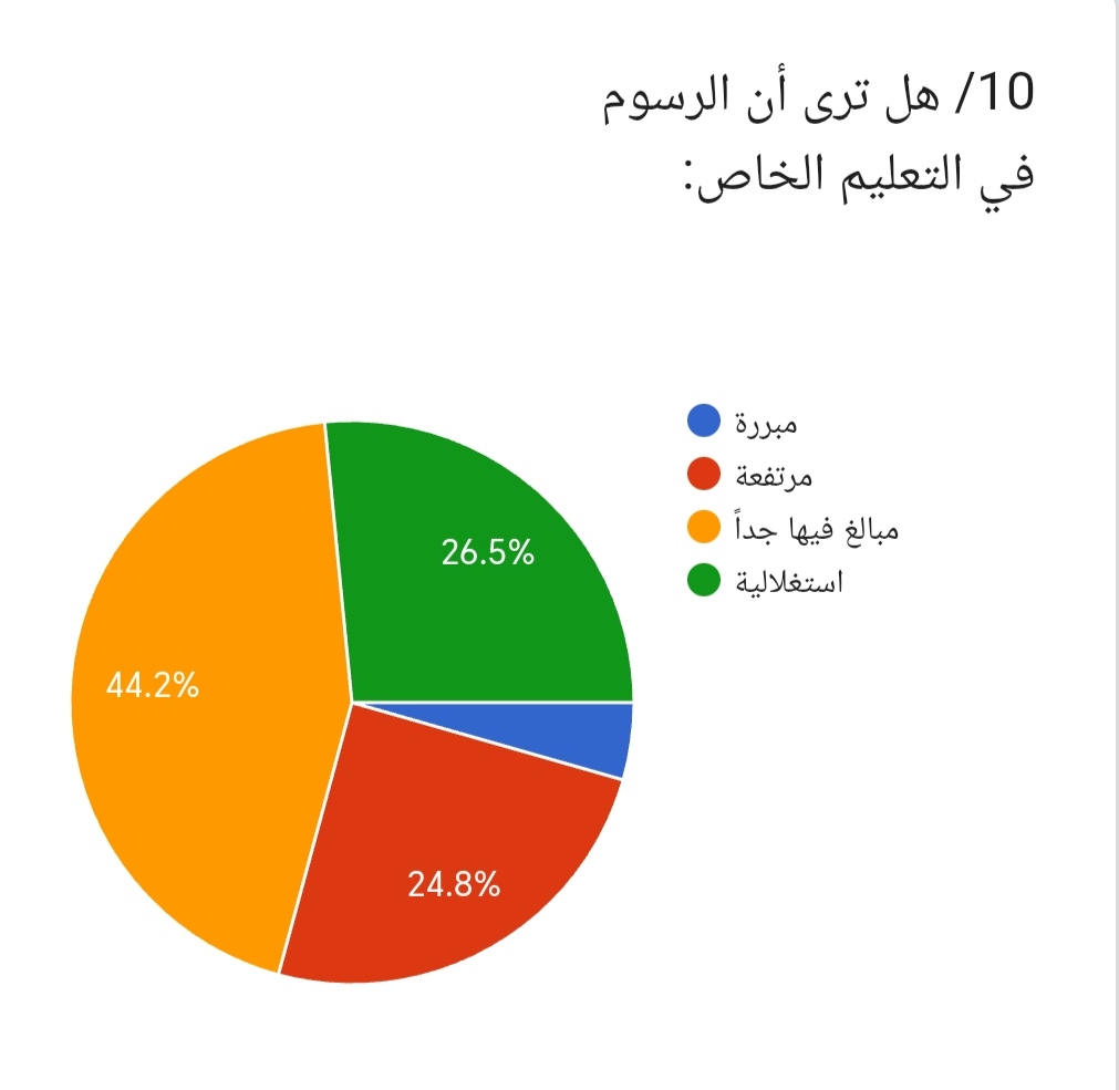 10/ وعند سؤال المشاركين: هل ترى أن الرسوم في التعليم الخاص؟ أجاب 44.2% مبالغ فيها جداً، بينما قال 24.8% مرتفعة، في حين رأى 26.5% استغلالية، وأجاب 4.5% مبررة. ويؤكد ذلك أن غالبية المشاركين ترى أن رسوم التعليم الخاص مرتفعة وغير مناسبة.