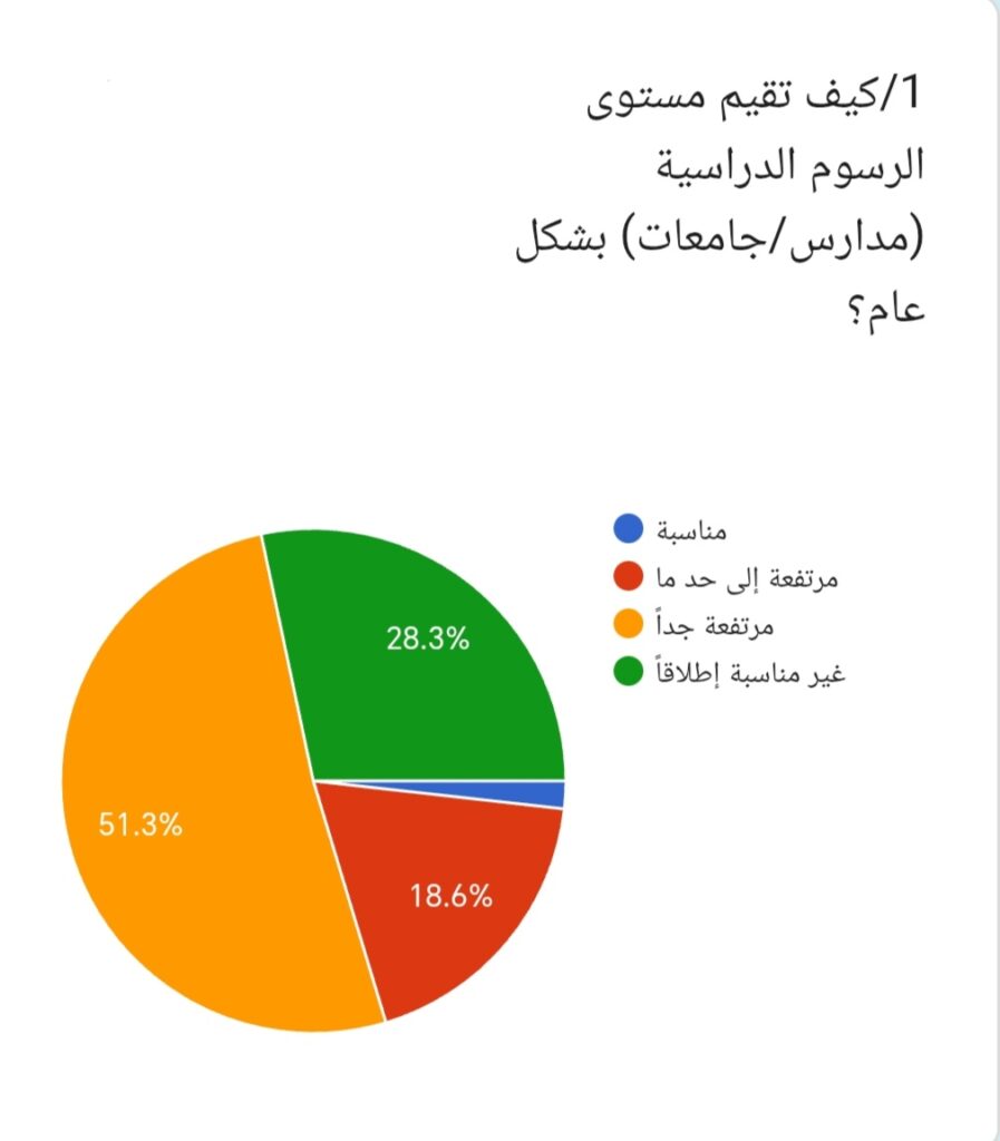 1/ لدى سؤال المشاركين عن كيفية تقييم مستوى الرسوم الدراسية (مدارس/جامعات) بشكل عام، أجاب 51.3% بأنها مرتفعة جداً، بينما قال 18.6% إنها مرتفعة إلى حد ما، في حين رأى 28.3% أنها غير مناسبة إطلاقاً، وأشار 1.8% إلى أنها مناسبة. وتوضح هذه النتائج أن الاتجاه الغالب لدى المشاركين يميل إلى اعتبار الرسوم الدراسية مرتفعة بصورة كبيرة.