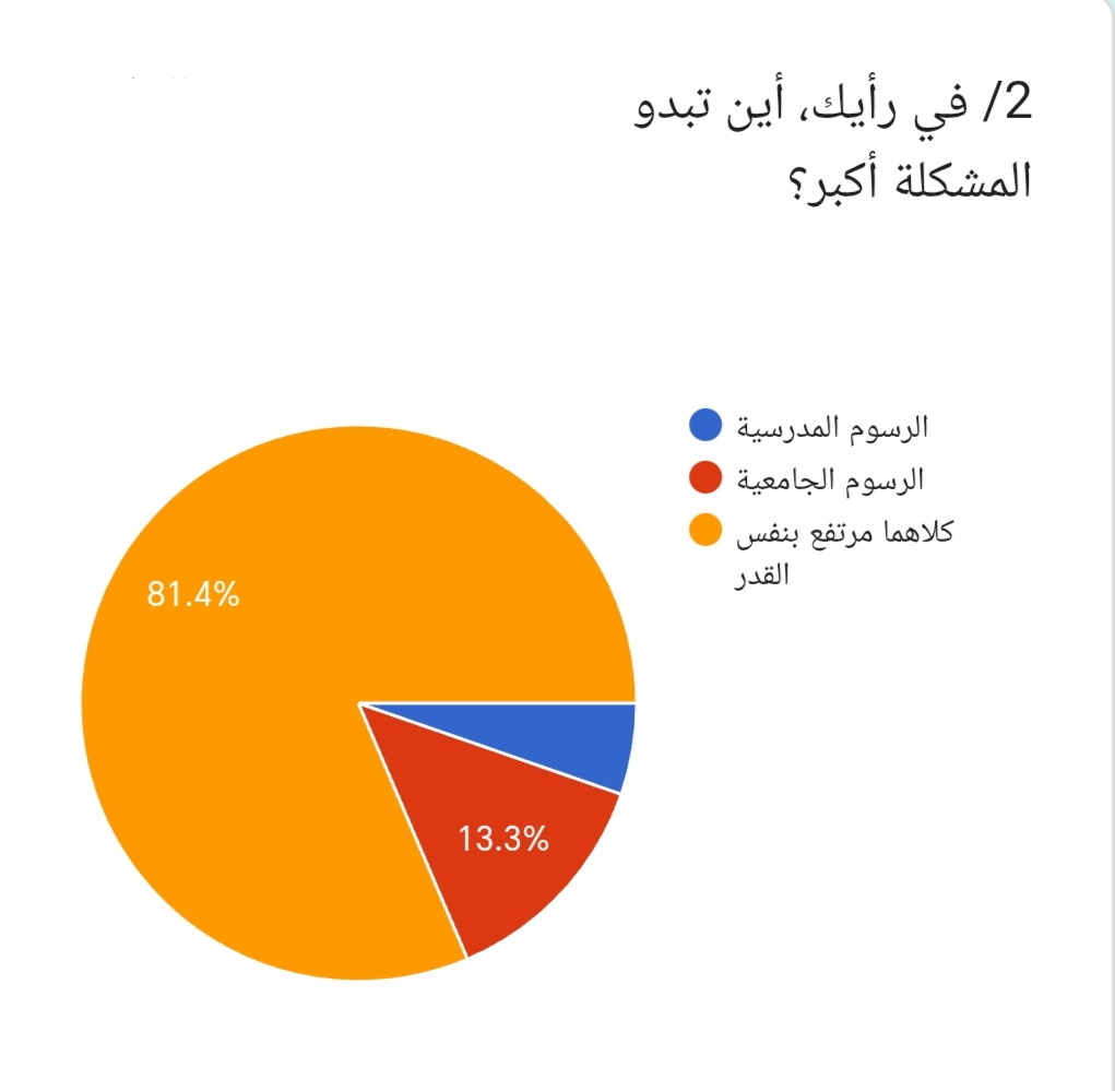 2/ وعند سؤال المشاركين: أين تبدو المشكلة أكبر؟ أجاب 81.4% بأن الرسوم المدرسية والجامعية مرتفعة بنفس القدر، بينما رأى 13.3% أن المشكلة أكبر في الرسوم الجامعية، وقال 5.3% إن المشكلة في الرسوم المدرسية. وتبين هذه النتيجة أن مشكلة ارتفاع الرسوم تشمل مختلف مراحل التعليم.