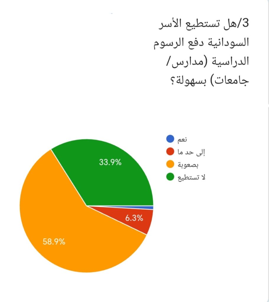 3/ وعند سؤال المشاركين: هل تستطيع الأسر السودانية دفع الرسوم الدراسية بسهولة؟ أجاب 58.9% بصعوبة، بينما قال 33.9% لا تستطيع، في حين رأى 6.3% إلى حد ما، وأجاب 0.9% نعم. وتظهر هذه النتائج أن غالبية الأسر تواجه تحديات مالية واضحة في سداد الرسوم الدراسية.