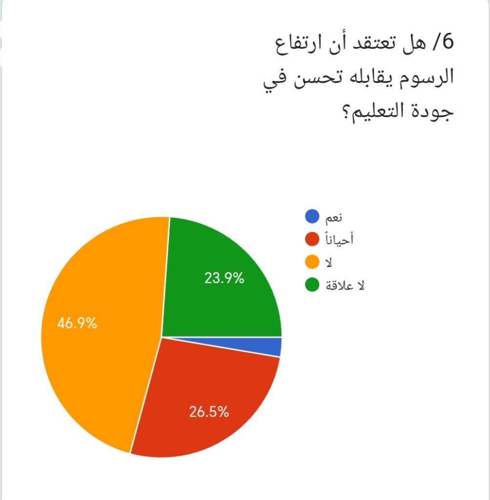 6/ وعند سؤال المشاركين: هل تعتقد أن ارتفاع الرسوم يقابله تحسن في جودة التعليم؟ أجاب 46.9% لا، بينما قال 23.9% لا علاقة، في حين رأى 26.5% أحياناً، وأجاب 2.7% نعم. ويعكس ذلك عدم وجود قناعة عامة بأن ارتفاع الرسوم يؤدي إلى تحسين جودة التعليم.
