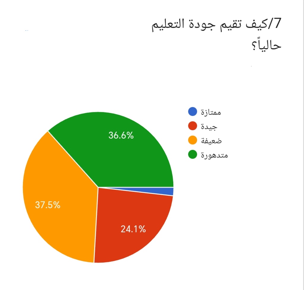 7/ وعند سؤال المشاركين عن كيفية تقييم جودة التعليم حالياً، أجاب 37.5% بأنها ضعيفة، بينما قال 36.6% متدهورة، في حين رأى 24.1% جيدة، وأجاب 1.8% ممتازة. وتشير هذه القراءة إلى أن تقييم جودة التعليم يميل في مجمله إلى السلبية.