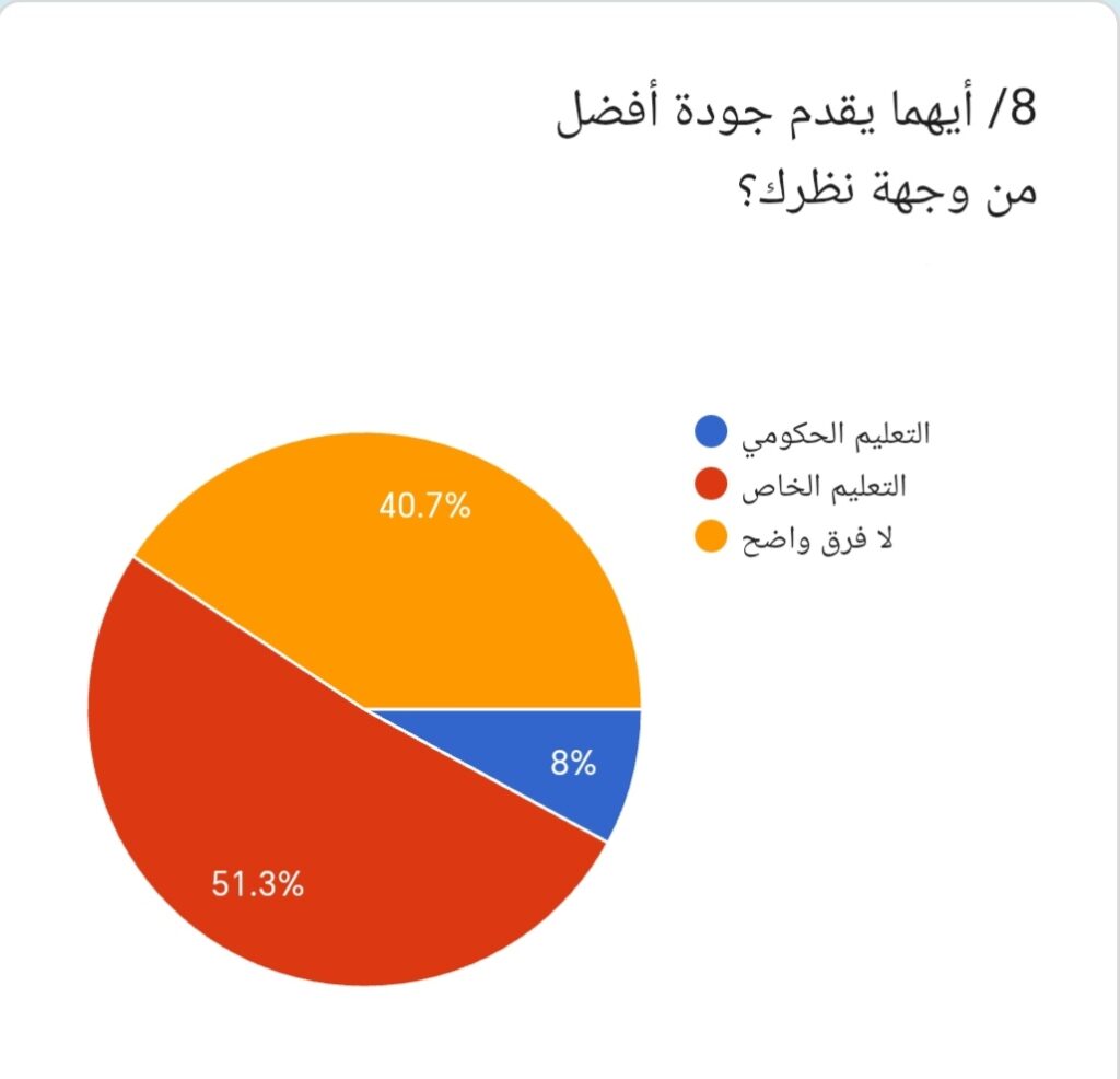 8/ وعند سؤال المشاركين: أيهما يقدم جودة أفضل من وجهة نظرك؟ أجاب 51.3% التعليم الخاص، بينما قال 8% التعليم الحكومي، في حين رأى 40.7% لا فرق واضح. وتوضح هذه النتائج أن التعليم الخاص يُنظر إليه كخيار أفضل نسبياً رغم ارتفاع تكلفته.