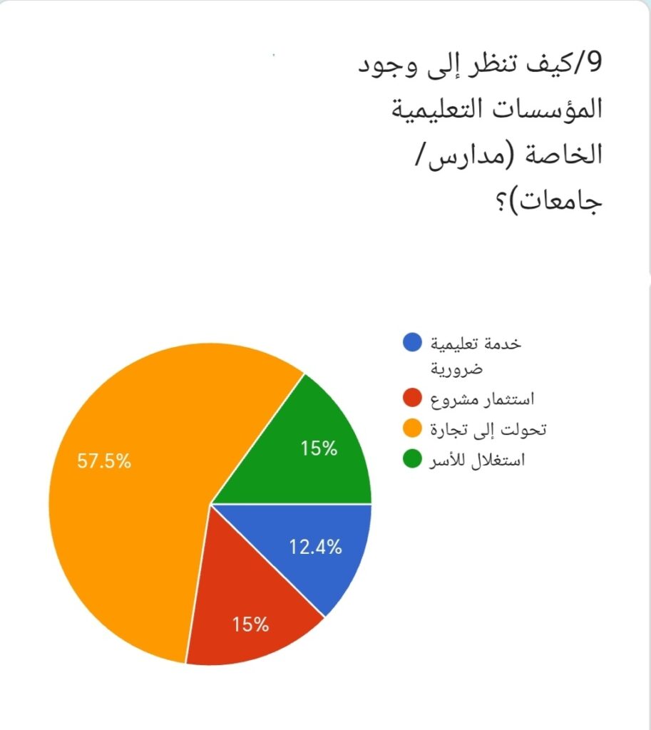 9/ وعند سؤال المشاركين: كيف تنظر إلى وجود المؤسسات التعليمية الخاصة؟ أجاب 57.5% تحولت إلى تجارة، بينما قال 15% استثمار مشروع، في حين رأى 15% استغلال للأسر، وأجاب 12.4% خدمة تعليمية ضرورية. وتبرز هذه النتيجة أن النظرة السائدة تعتبر التعليم الخاص نشاطاً تجارياً في المقام الأول.