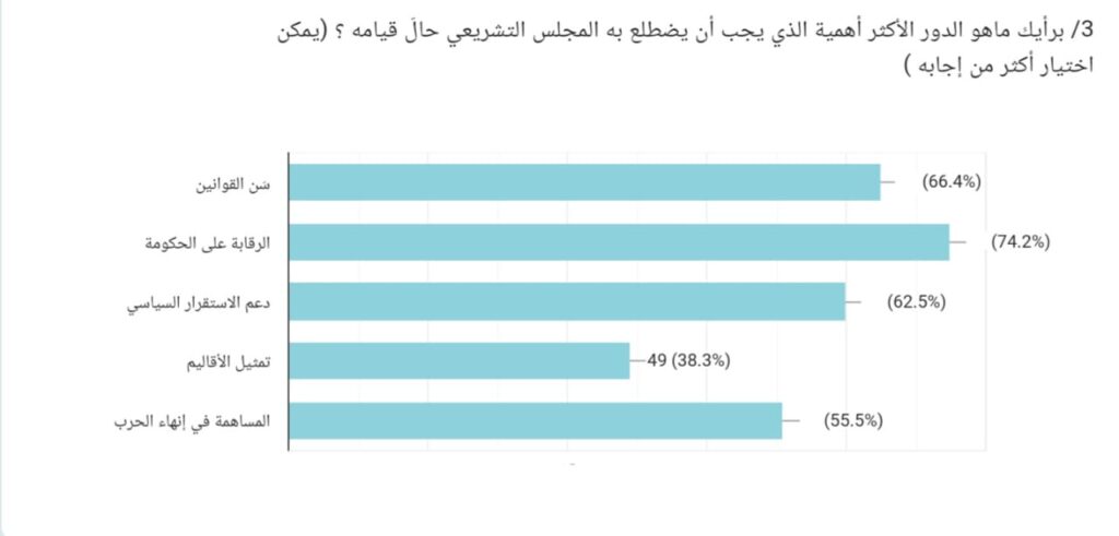1/لدى سؤال المشاركين عما اذا كان تكوين المجلس التشريعي يمثل اولوية في الظروف الحالية التي تمر بها البلاد، اجاب %55.4 بنعم، بينما قال %30 لا، في حين رأى %14.6 ربما. وتشير هذه النتيجة الى ان اكثر من نصف المشاركين يرون ان تكوين المجلس التشريعي يمثل خطوة مهمة في هذه المرحلة رغم وجود شريحة ترى ان الظروف الراهنة قد تفرض اولويات اخرى.