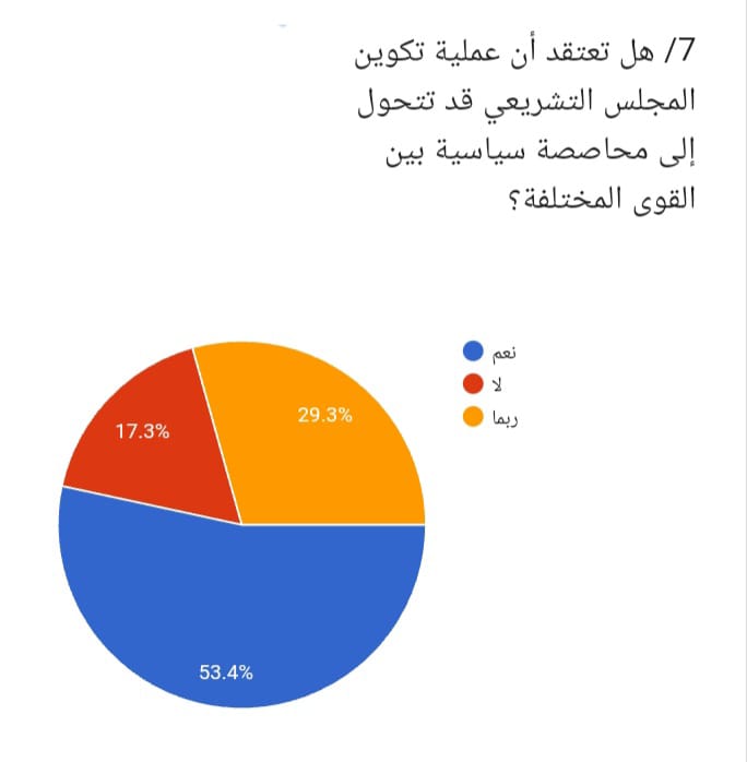 6/ وعند سؤال المشاركين عما اذا كانت عملية تكوين المجلس التشريعي قد تتحول الى محاصصة سياسية بين القوى المختلفة، اجاب %53.4 بنعم، بينما قال %29.3 ربما، في حين رأى %17.3 لا. وتكشف هذه النتيجة عن مخاوف واضحة لدى الرأي العام من احتمال تحول عملية التشكيل الى تنافس سياسي على المقاعد.