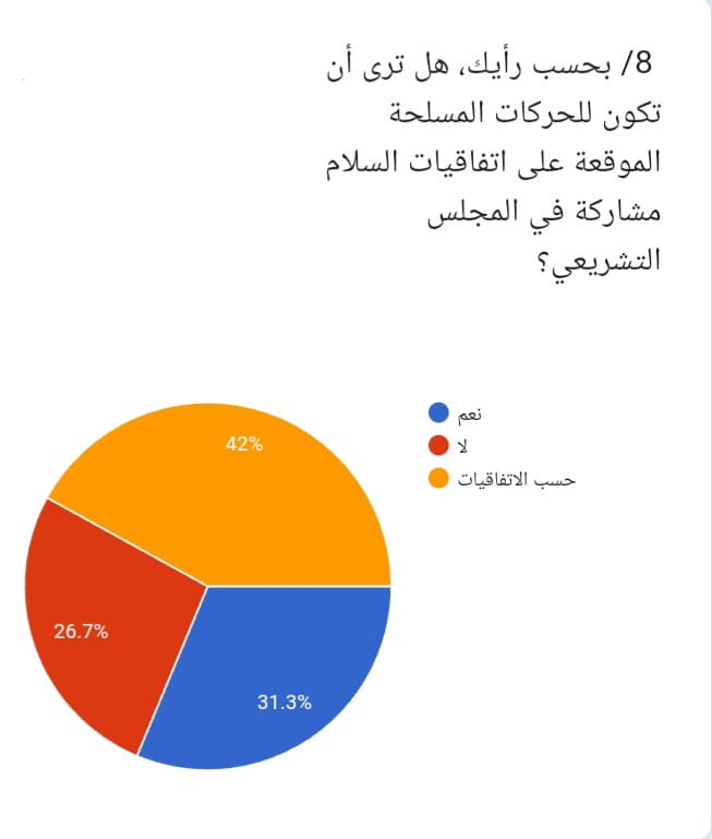 8/وعند سؤال المشاركين عما اذا كانت مشاركة الحركات المسلحة في المجلس التشريعي قد تساعد في تحقيق الاستقرار السياسي في البلاد، اجاب %38.8 بنعم، بينما قال %34.1 ربما، في حين رأى %27.1 لا. وتعكس هذه النتيجة تباينا نسبيا في تقييم تأثير هذه المشاركة على الاستقرار السياسي.
